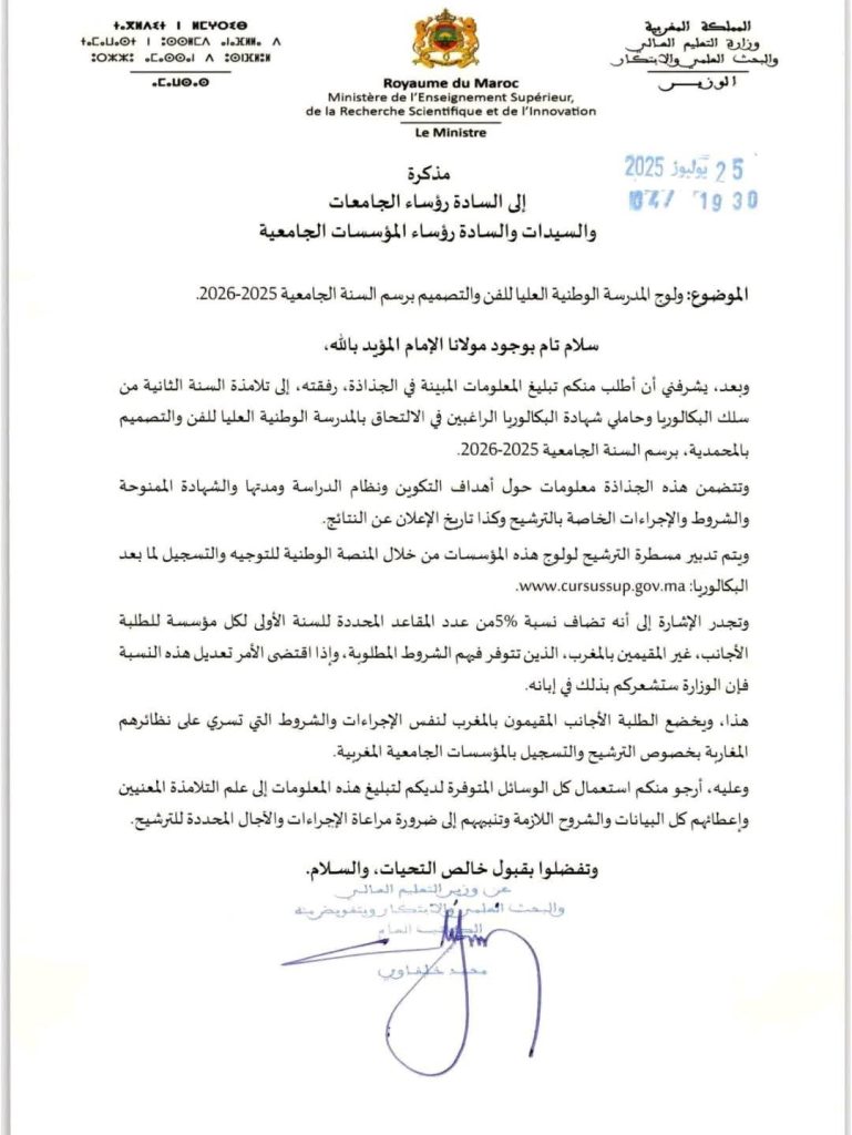 🔔 تنبيه مهم: على المرشحين الحاصلين على بكالوريا أجنبية تحميل الوثائق الإضافية (شهادة المعادلة، بطاقة التعريف، كشف النقط…) على نفس المنصة قبل 23 غشت.
